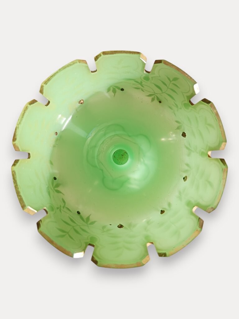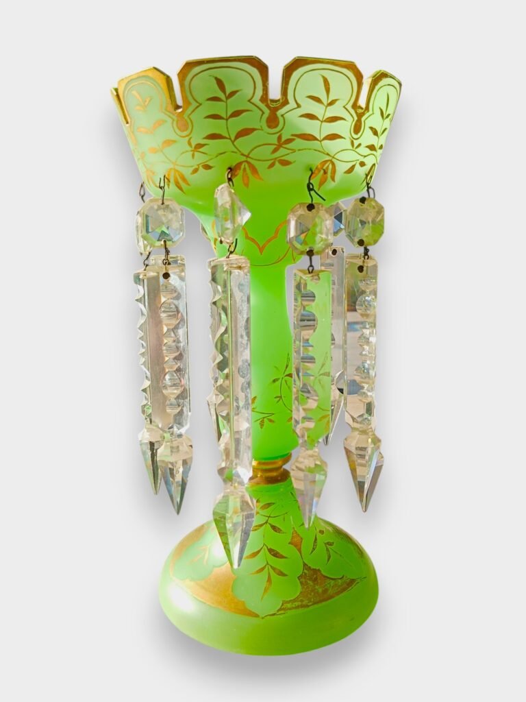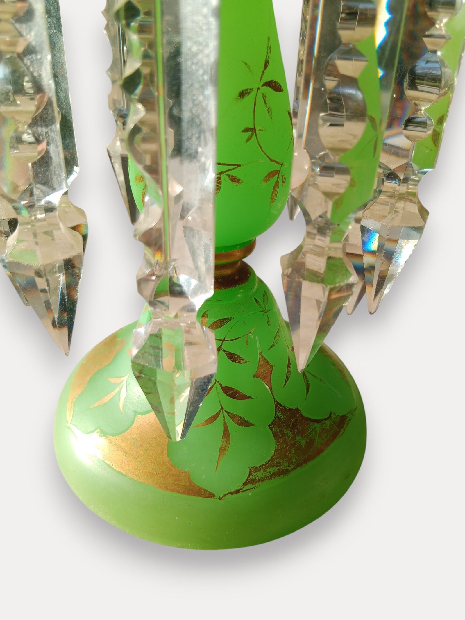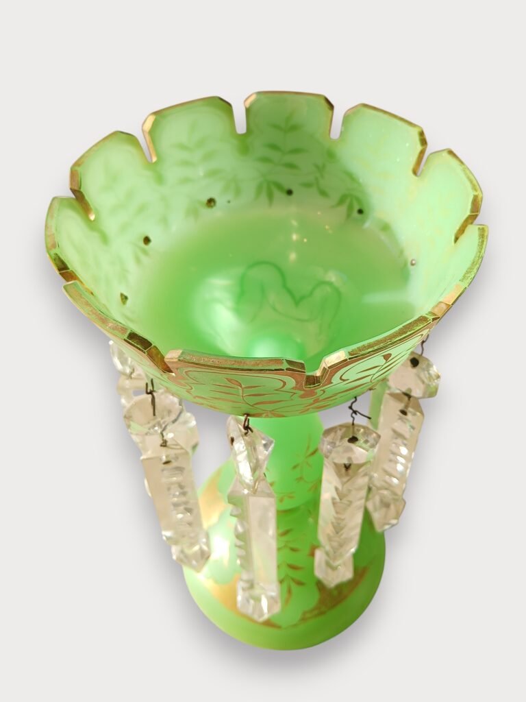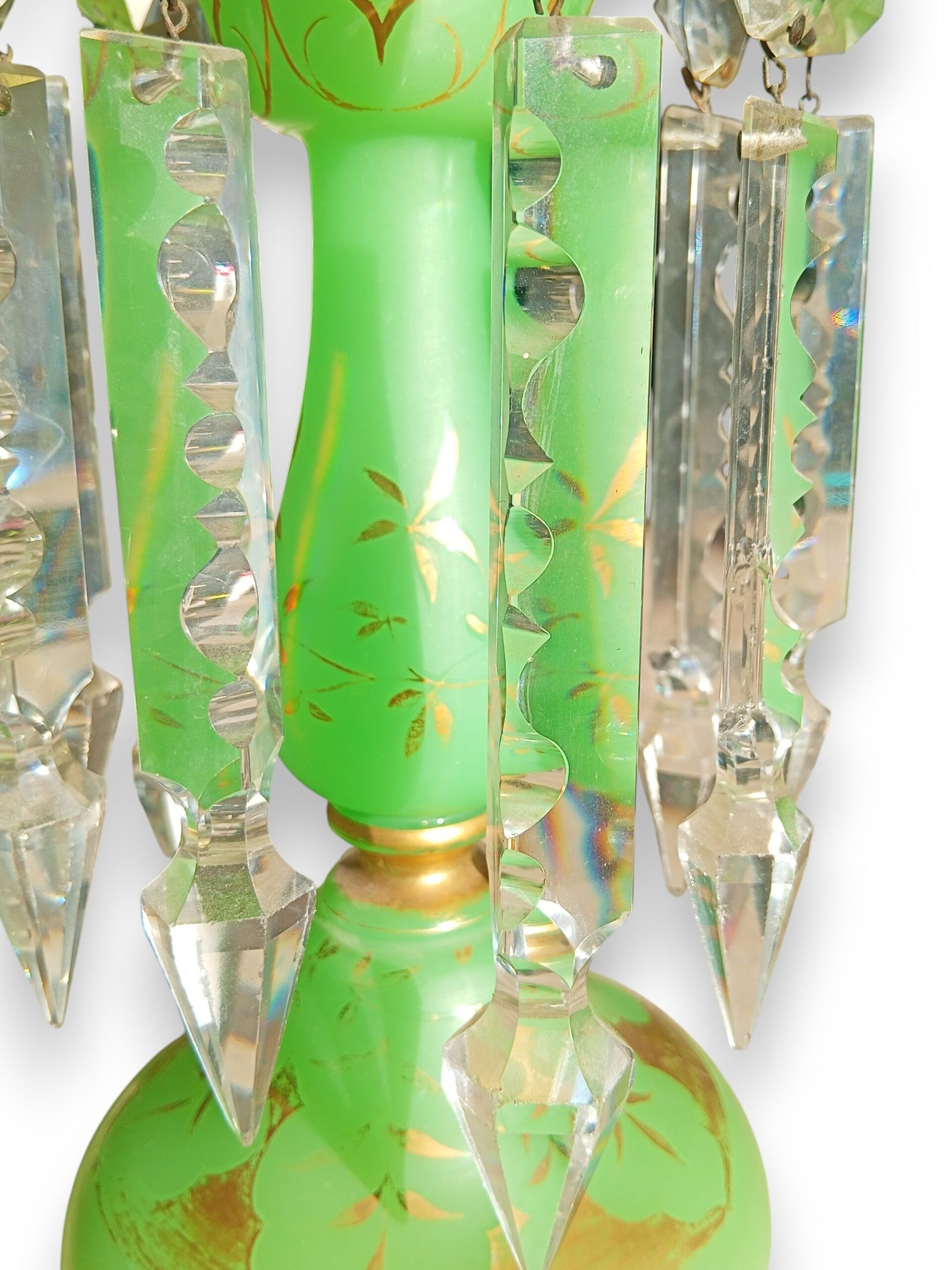 Elegante antieke lustervaas uit circa 1880, vervaardigd uit groen opaline glas en rijkelijk versierd met handgeschilderde gouden florale decoratie. Het stuk is afgewerkt met originele geslepen kristallen hangers en prisma’s, die het licht op prachtige wijze breken.