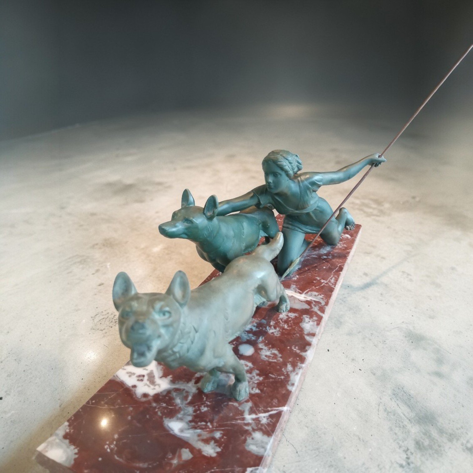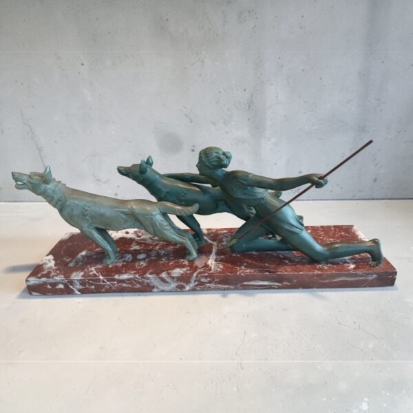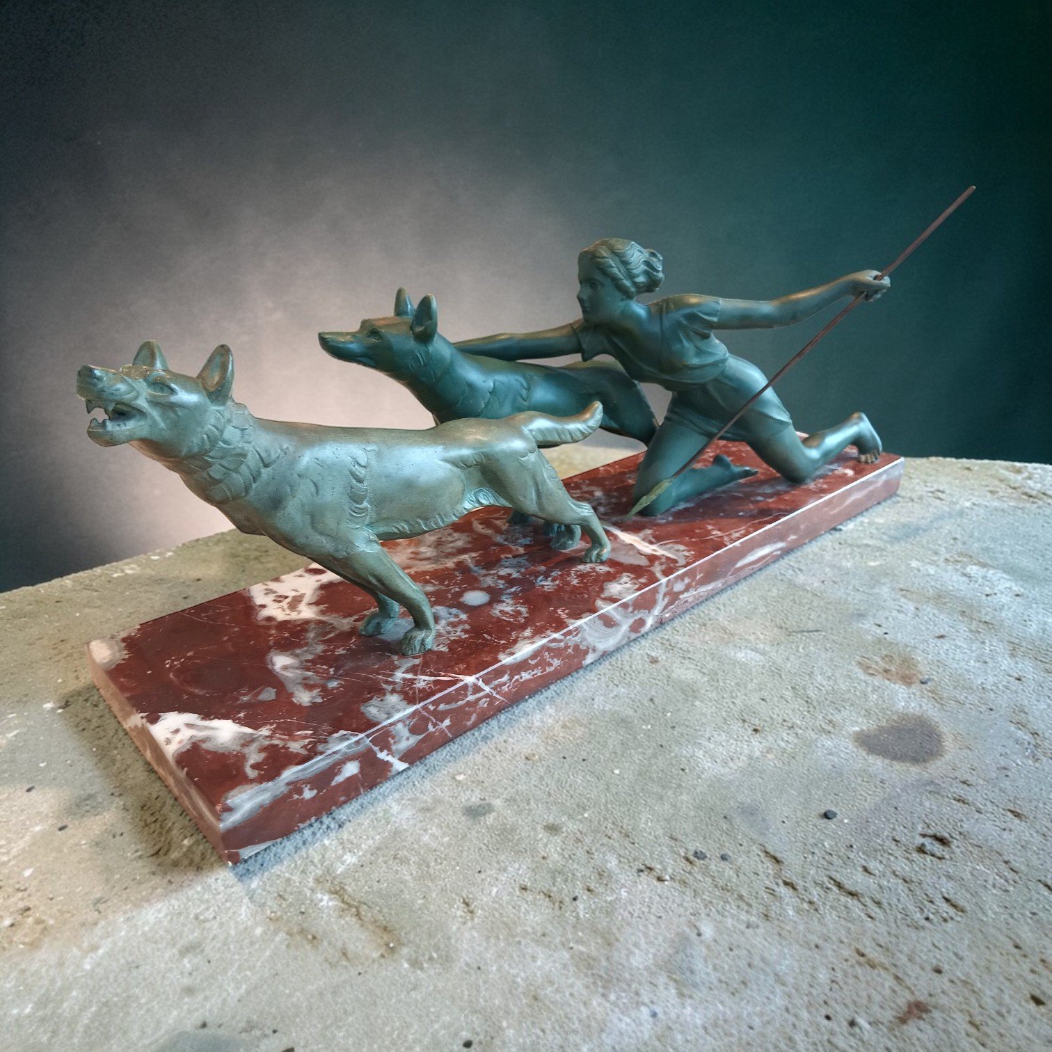Elegant Art Deco beeld van de jachtgodin Diana met twee jachthonden, uitgevoerd in gepatineerd metaal en geplaatst op een rode marmeren sokkel. Het beeld is gesigneerd Laurens.
