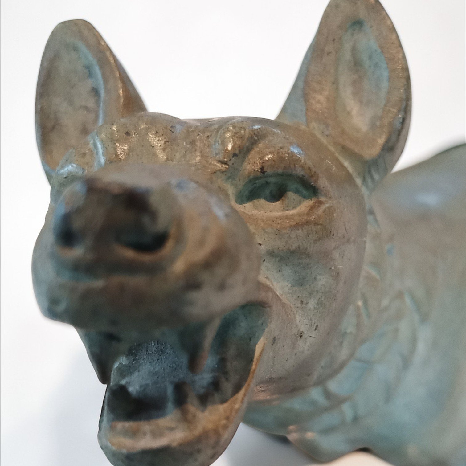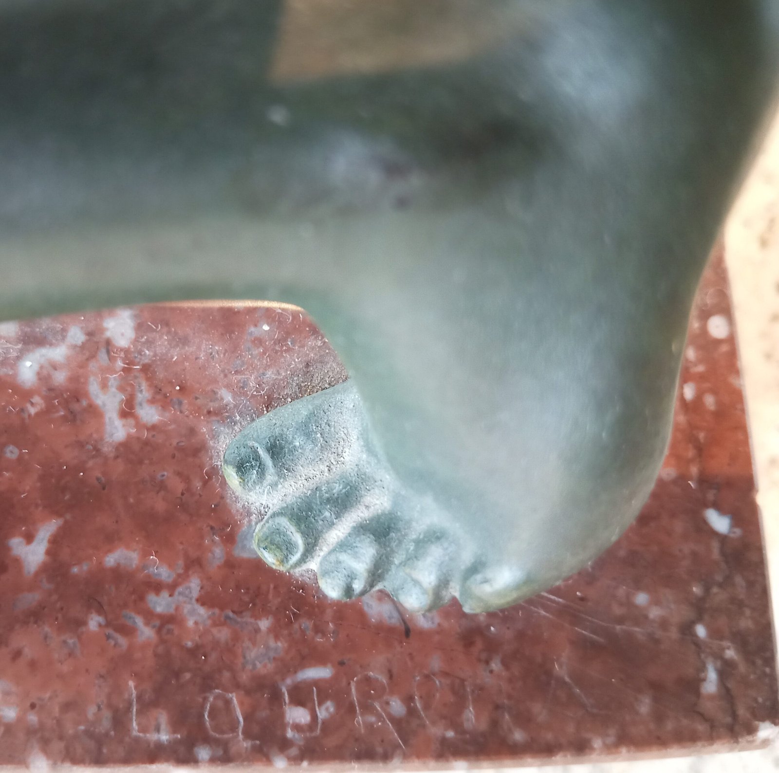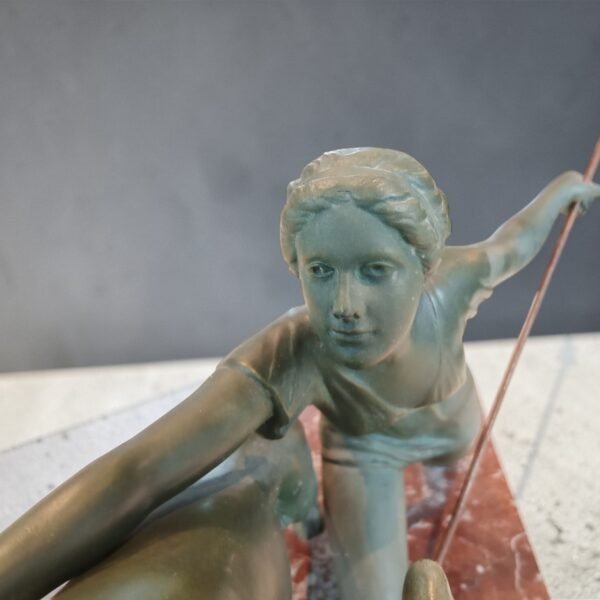 De combinatie van het metalen beeld met de rode marmeren voet geeft het geheel een luxe en decoratieve uitstraling. Een prachtig object voor liefhebbers van Art Deco, jachttaferelen of vintage sculpturen.