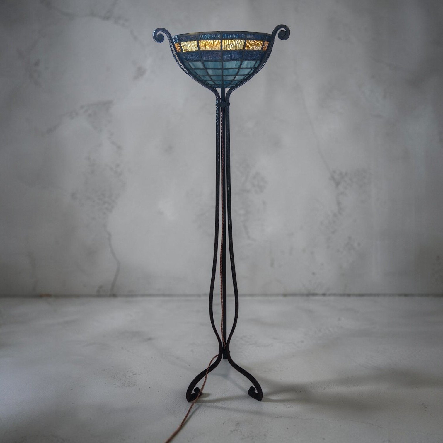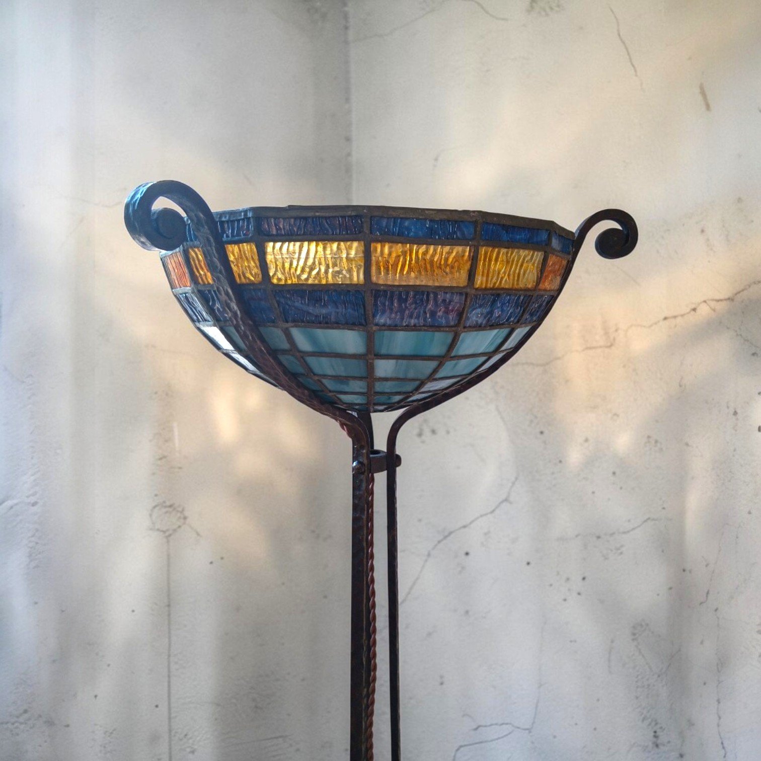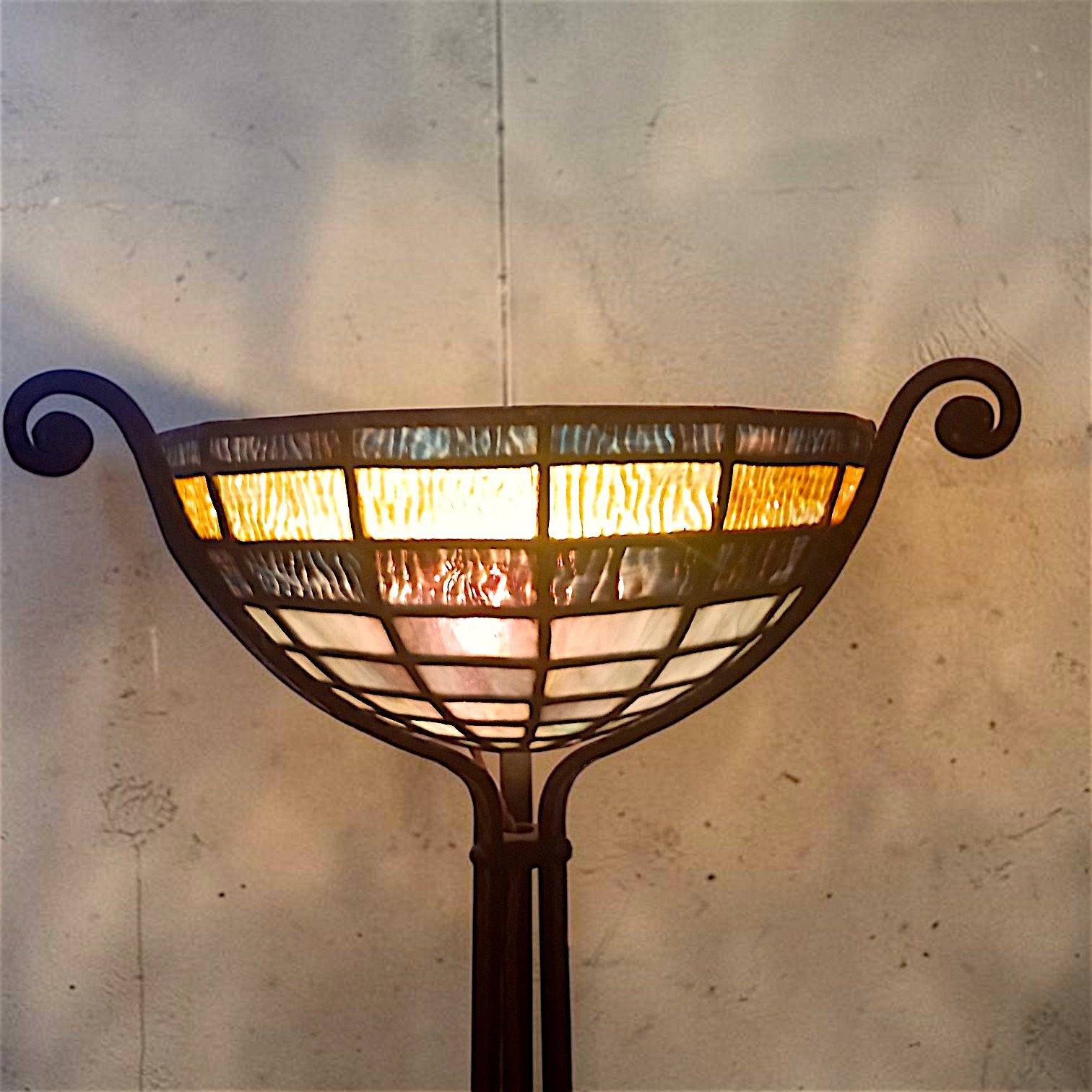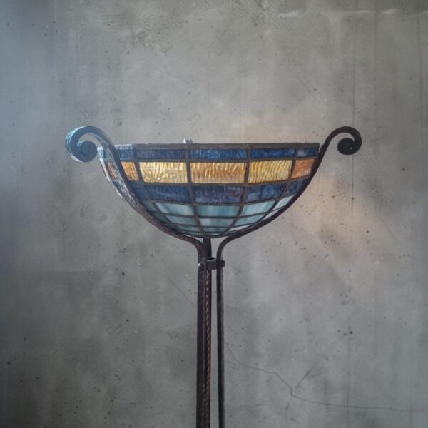 Een opvallende en sfeervolle vloerlamp torchière uit het begin van de 20e eeuw, vervaardigd van handgesmeed smeedijzer en afgewerkt met een prachtig gekleurde glas-in-lood uplight kap. Dit stuk belichaamt de overgangsperiode tussen Art Nouveau en Art Deco, waarbij elegante organische lijnen worden gecombineerd met opkomende geometrische structuren.