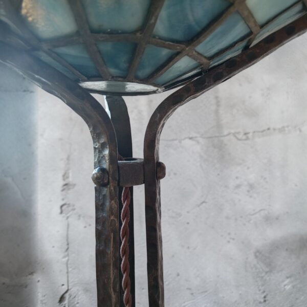 De slanke driepootbasis heeft met de hand gehammerd ijzerwerk met subtiele onregelmatigheden, een bewijs van traditioneel vakmanschap. De naar boven gerichte schaal bestaat uit afzonderlijk gezette glazen panelen in zachte blauwgroene tinten, geaccentueerd door een warme amberband—wat een rijke, sfeervolle gloed creëert wanneer verlicht.