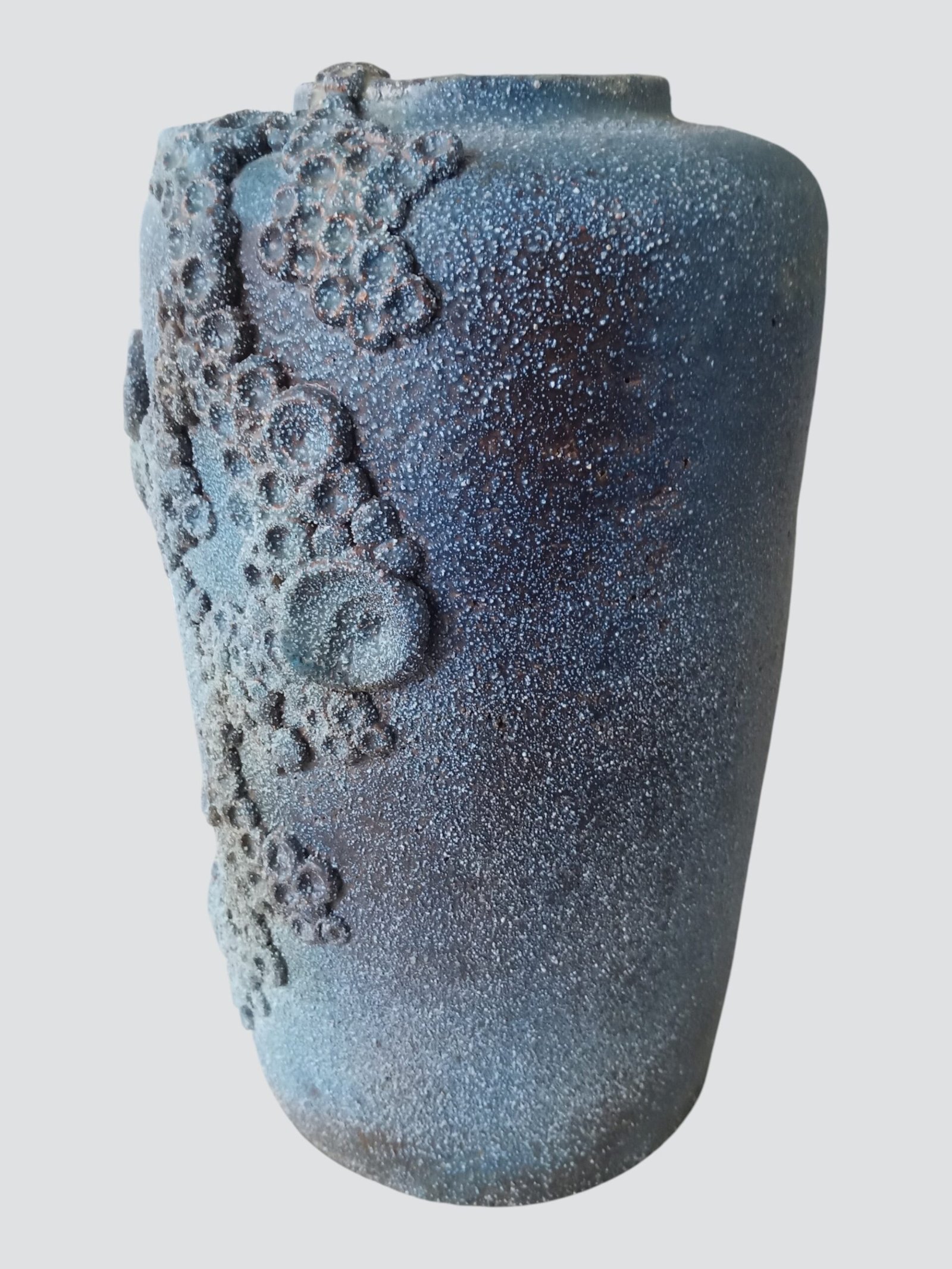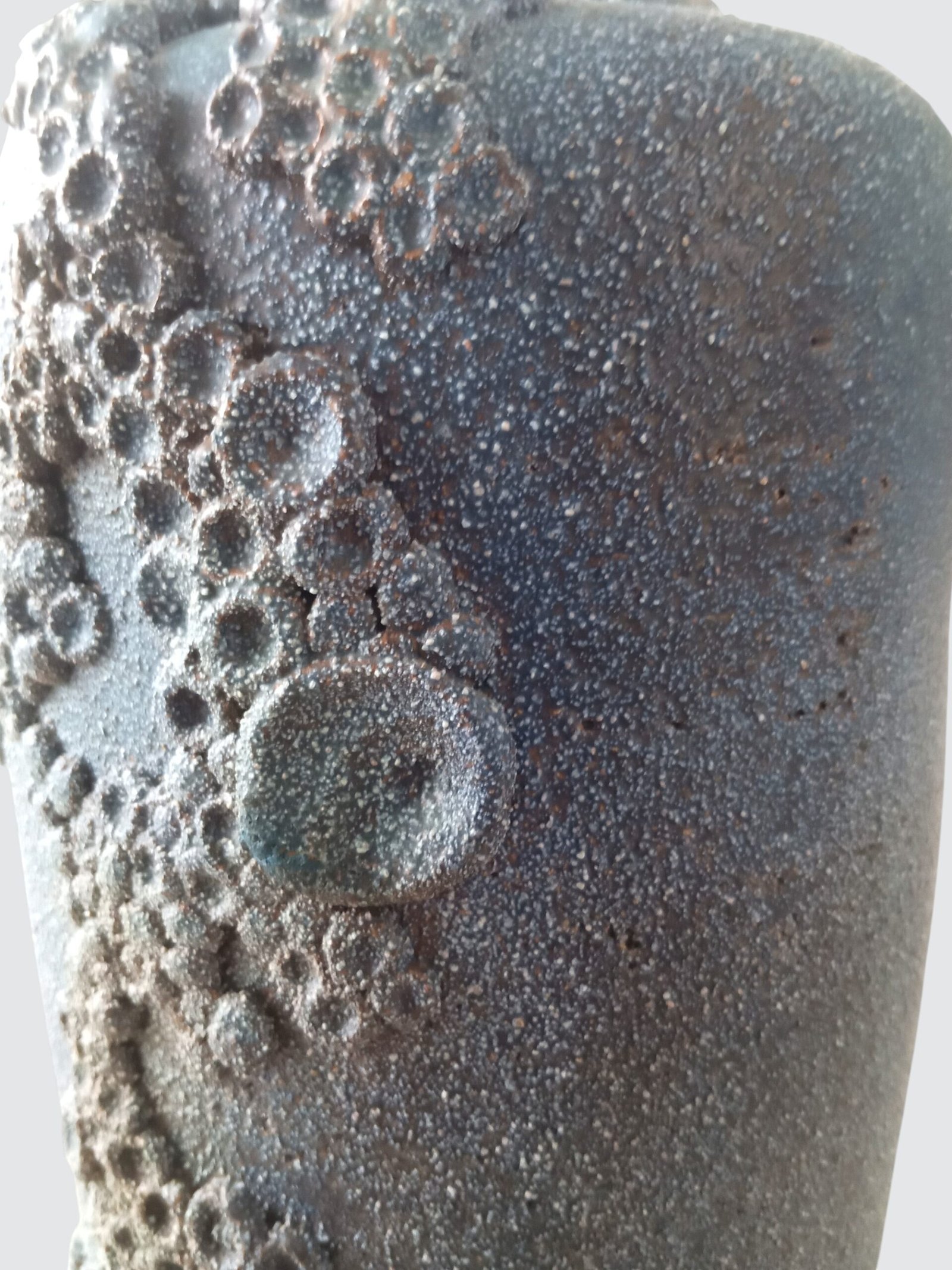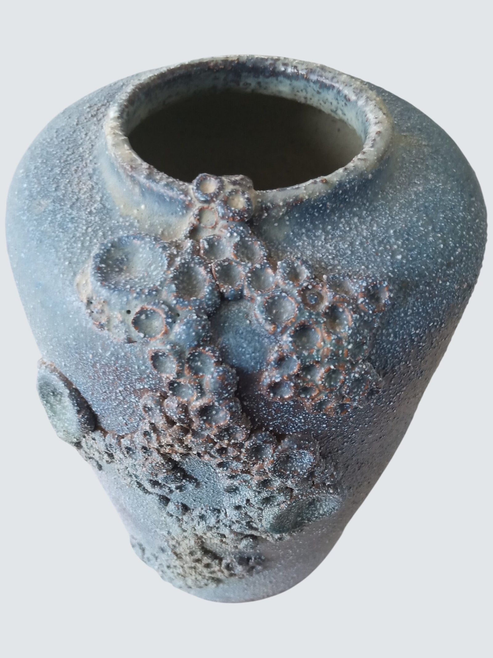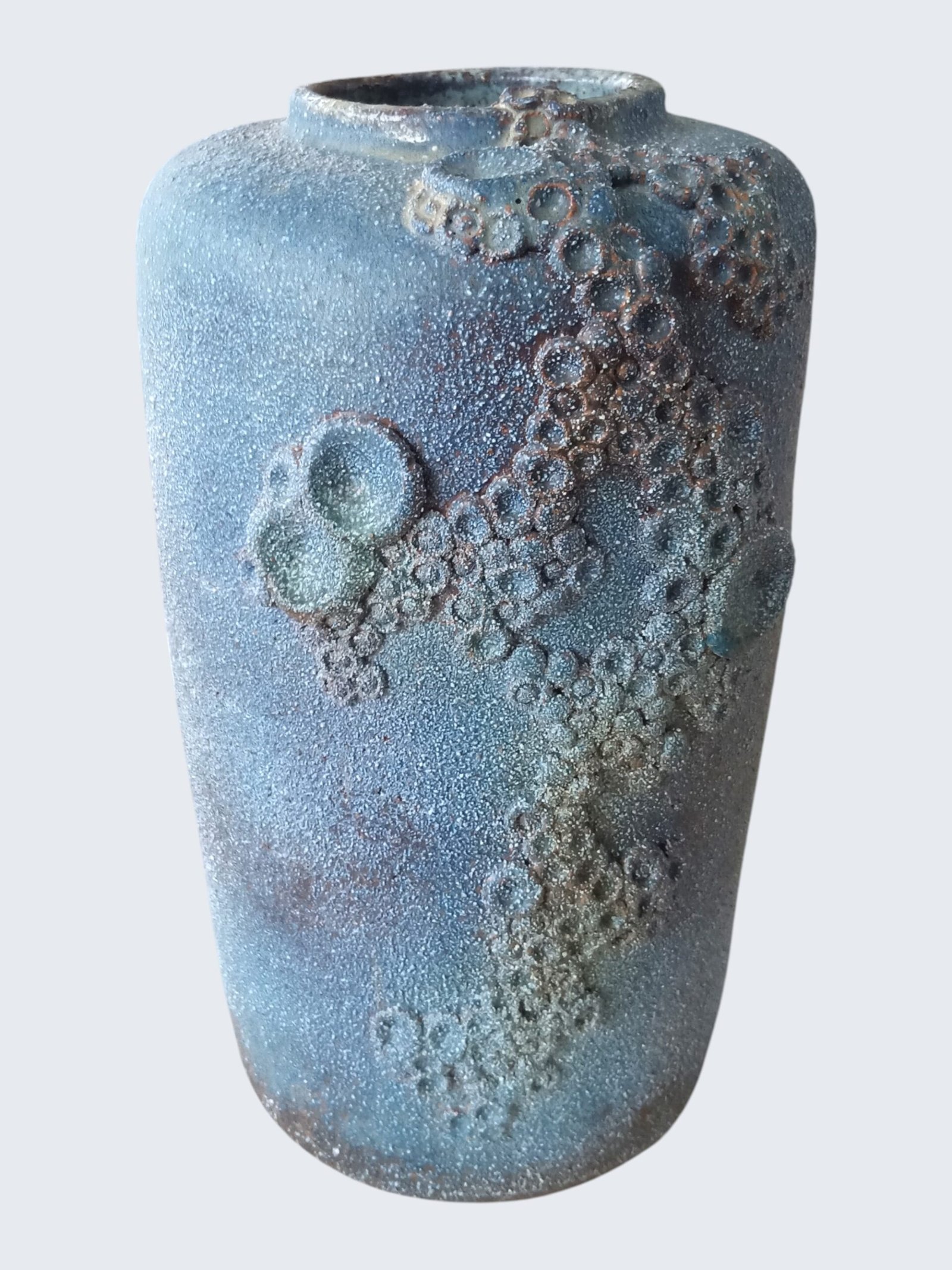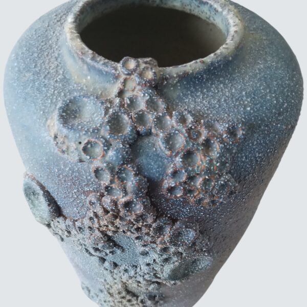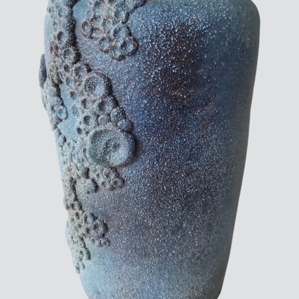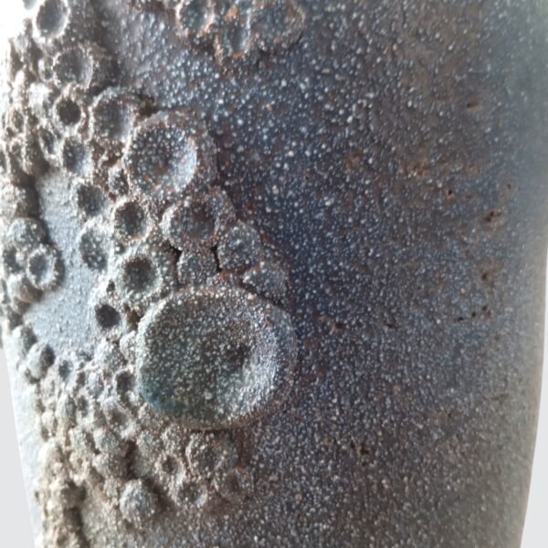 Loodzware, brutalist vintage keramische vaas uit de jaren 60/70, uitgevoerd in de kenmerkende brutalistische vormentaal die we associëren met Rogier Vandeweghe. De massieve vorm wordt gekenmerkt door diepe, uitgesproken craters die het oppervlak een ruwe, bijna vulkanische textuur geven.
