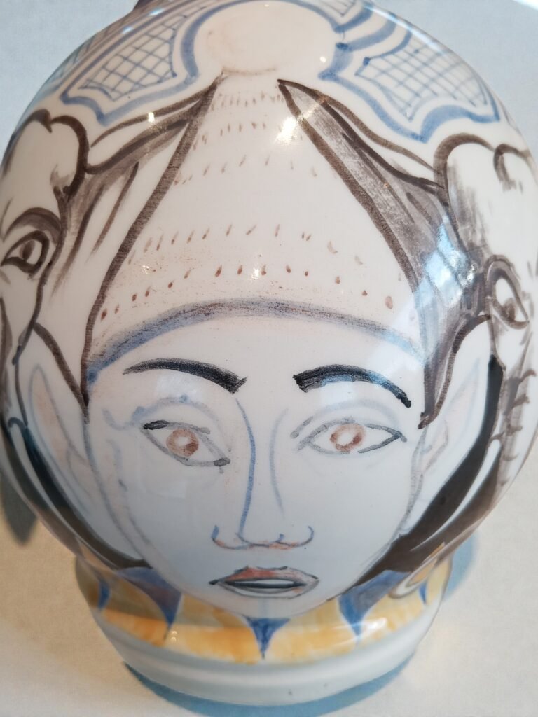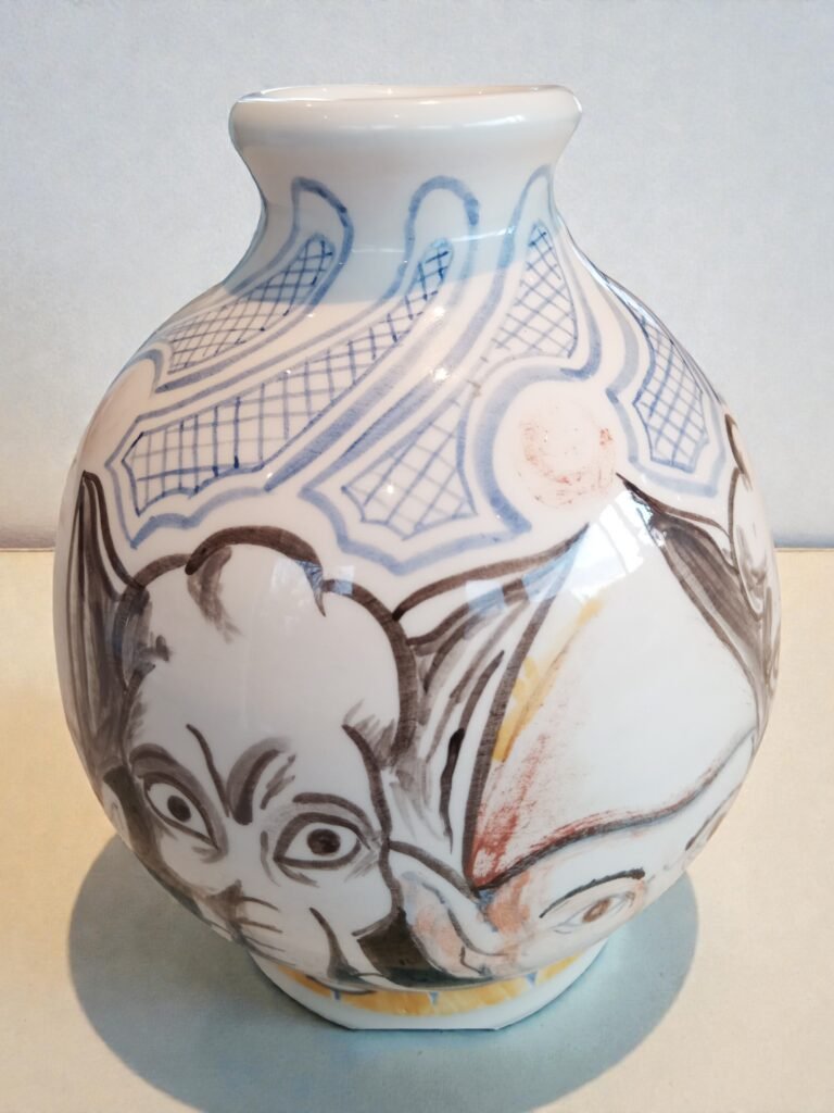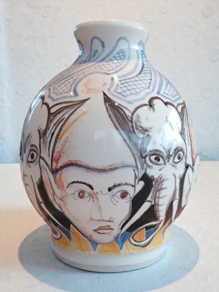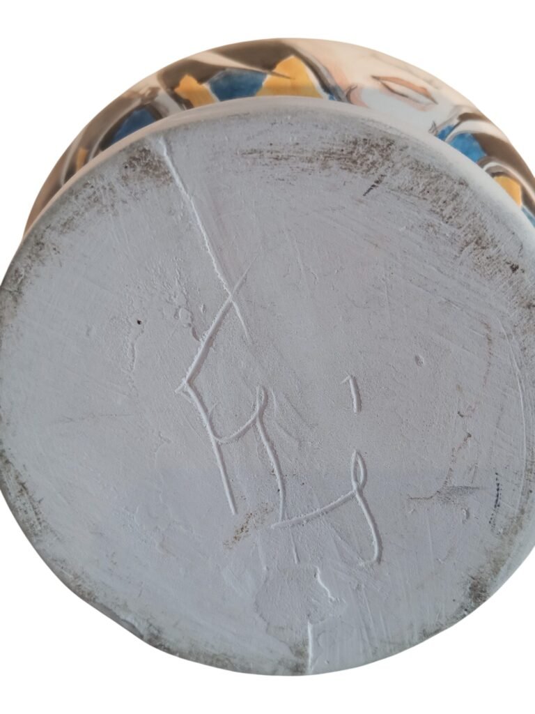 Expressieve studio-keramiek vaas met onderglazuur schildering, rondom gedecoreerd met figuren en diermotief. De vrije lijnvoering en speelse, circusachtige compositie vertonen verwantschap met modernistische keramiektradities in de geest van Picasso en tijdgenoten Circa 1950 - 1970. Voorzien van een ingekraste signatuur (monogram), aangebracht vóór het glazuren. De signatuur duidt op individueel kunstenaarschap; de maker is vooralsnog niet met zekerheid geïdentificeerd, wat ruimte laat voor verdere toeschrijving.