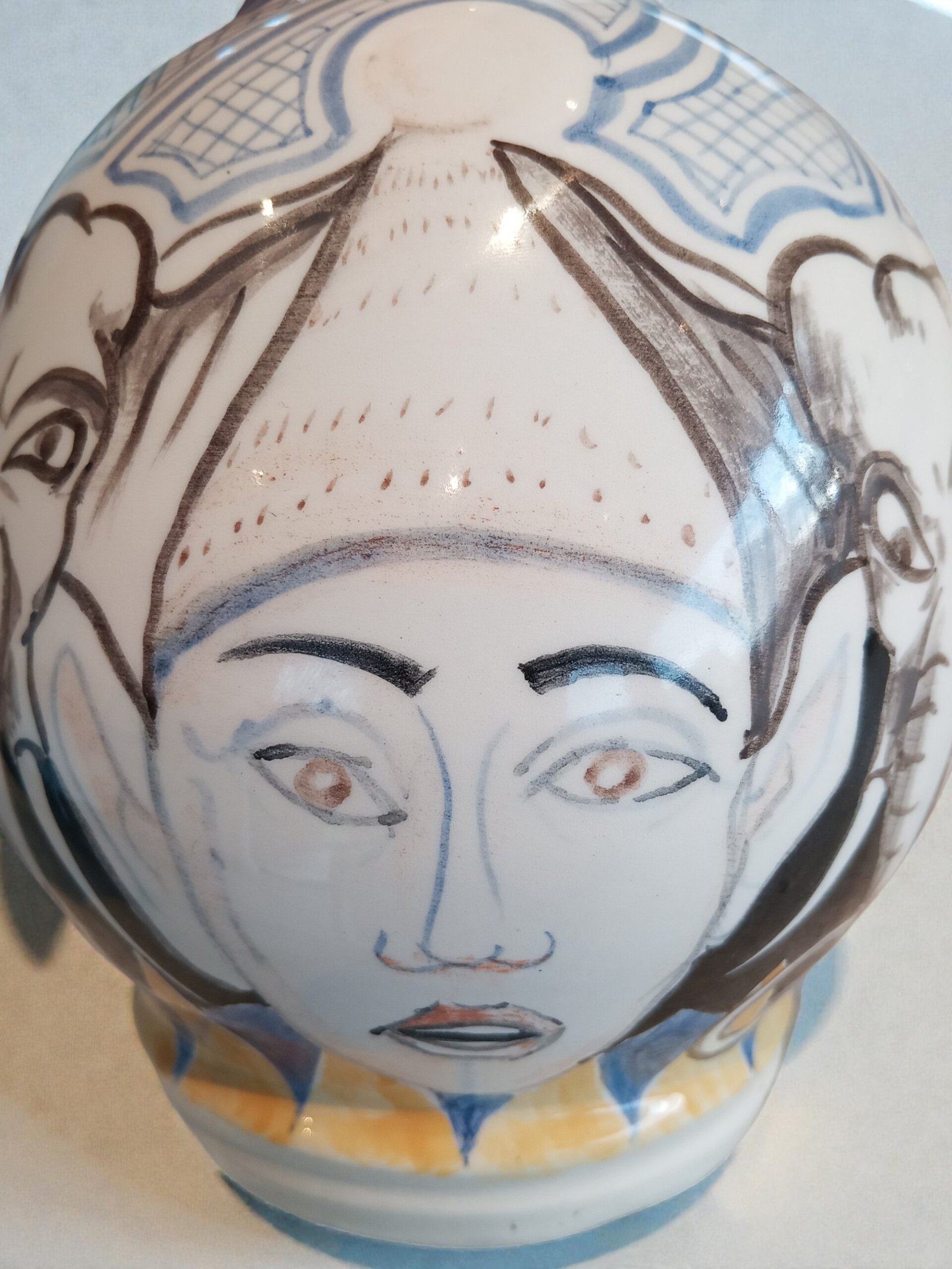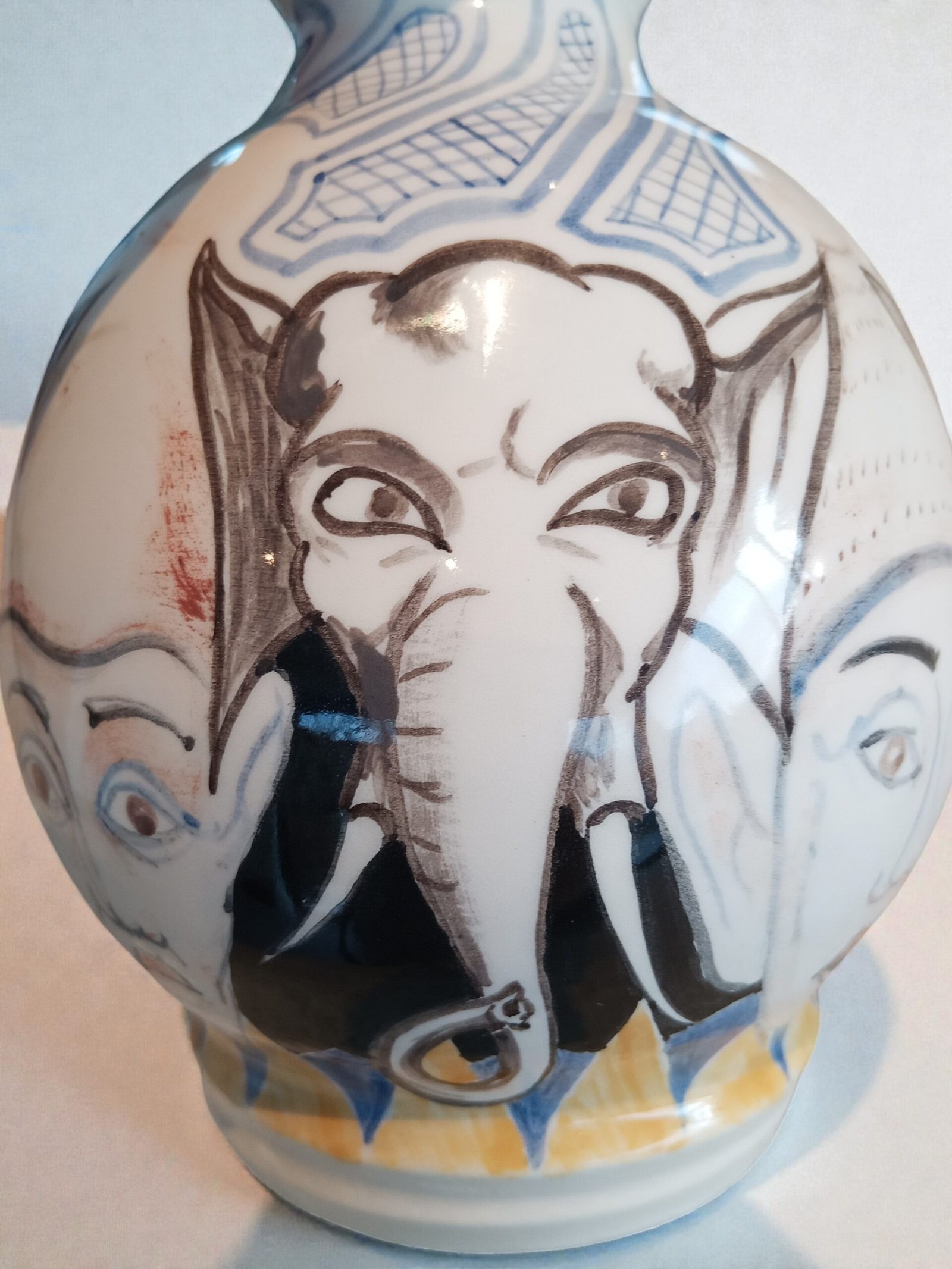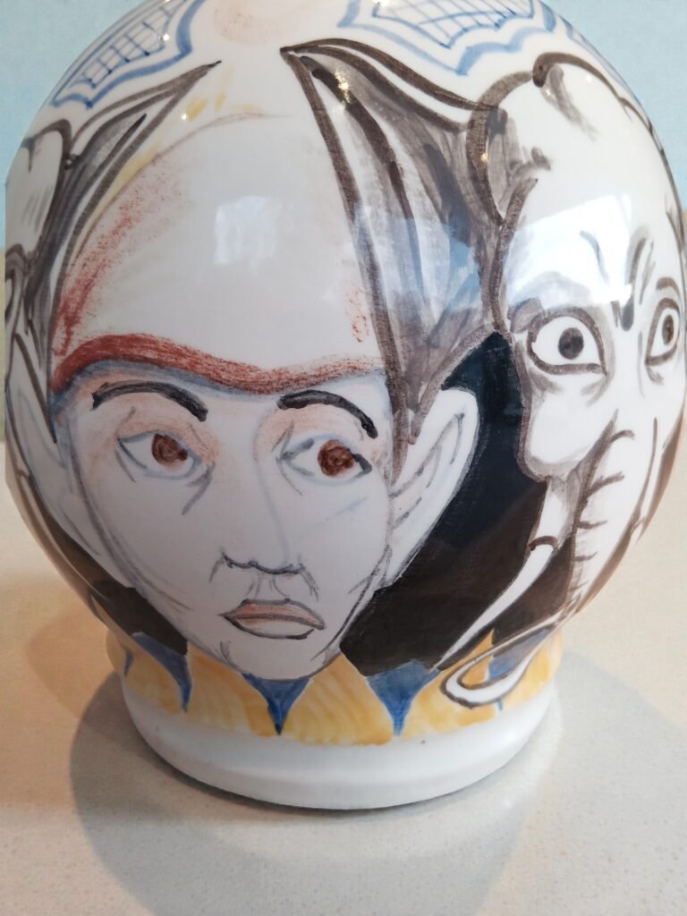 Expressieve studio-keramiek vaas met onderglazuur schildering, rondom gedecoreerd met figuren en diermotief. De vrije lijnvoering en speelse, circusachtige compositie vertonen verwantschap met modernistische keramiektradities in de geest van Picasso en tijdgenoten Circa 1950 - 1970. Voorzien van een ingekraste signatuur (monogram), aangebracht vóór het glazuren. De signatuur duidt op individueel kunstenaarschap; de maker is vooralsnog niet met zekerheid geïdentificeerd, wat ruimte laat voor verdere toeschrijving.