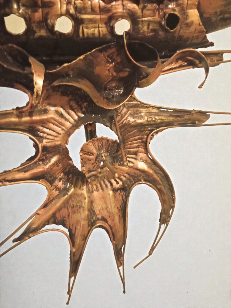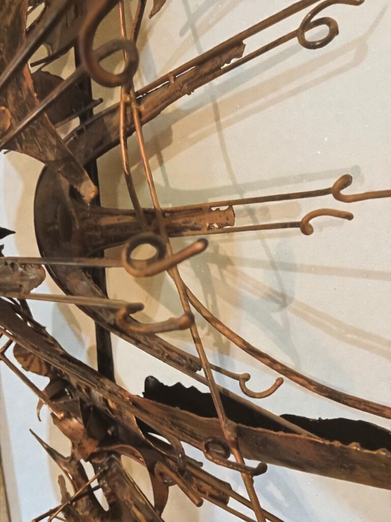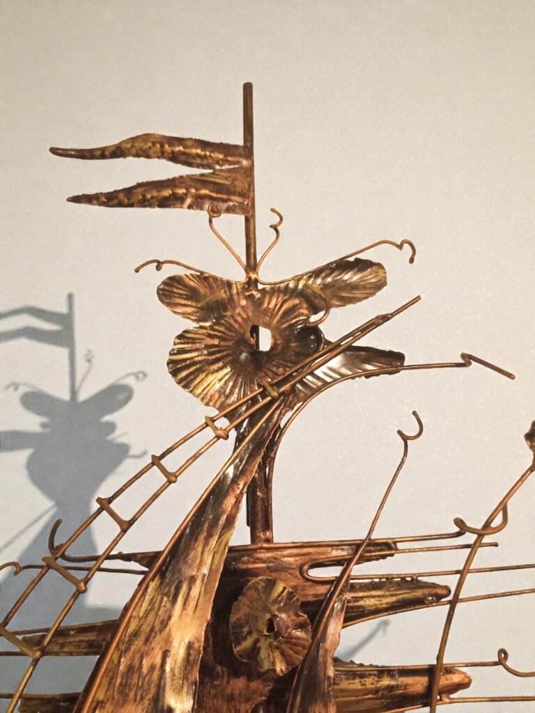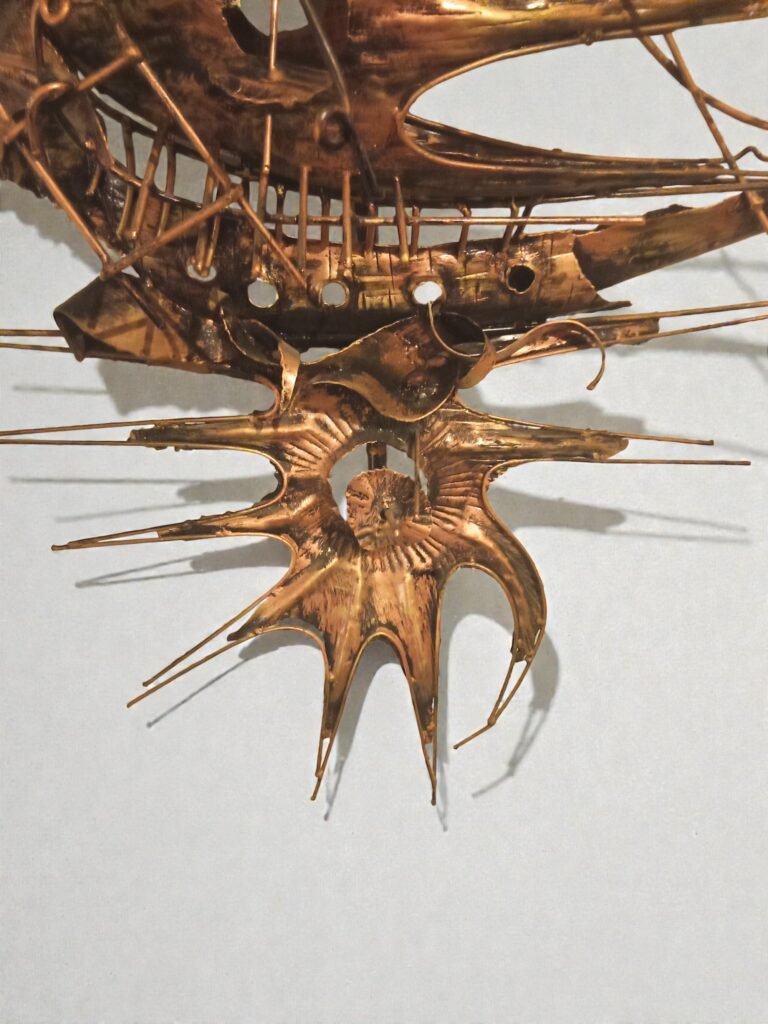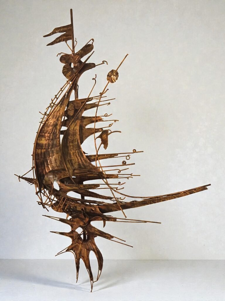 Futuristishe hand gemaakte metalen gehamerde wandsculptuur in Brutalistische stijl door M. Di Giovanni rond 1970 italie in de vorm van een schip. Dit werk is niet gesigneerd, maar kan aan de stijl met zekerheid zeggen dat het van M. Di Giovanni is.